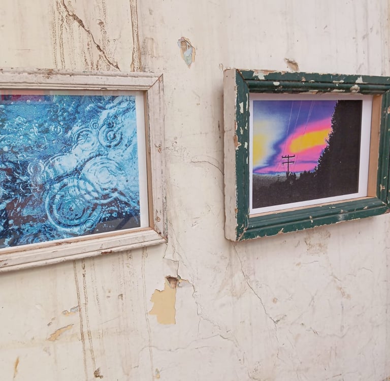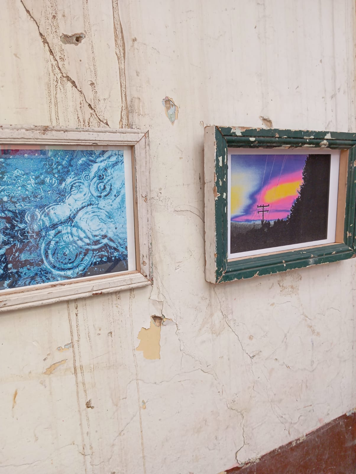 Me encuentro con una obra vibrante que no me esperaba, que resulta inspiradora aunque no logro describir por qué. Tal vez por el entorno inesperado en el que está expuesta, o por la resignificación de la lluvia como algo bueno. Tal vez por los marcos pelados y rotos que no dejan de llamar mi atención, o esa gotera que no deja de caer en un vaso con una tela verde que de algún modo forma parte de todo. O a lo mejor es el bendito confeti, que quiero que tenga una historia que a lo mejor no tiene, pero no paro de pensar en él.